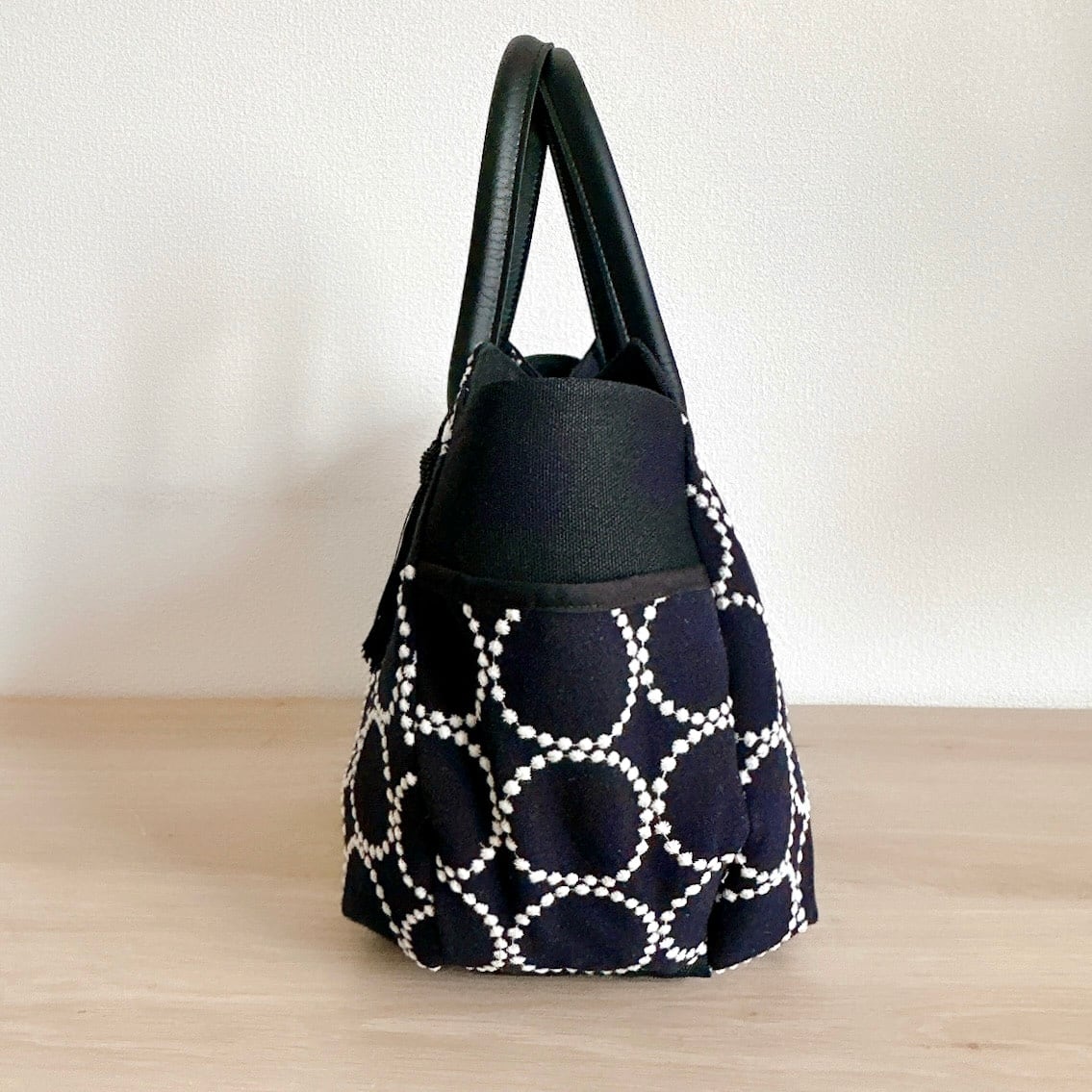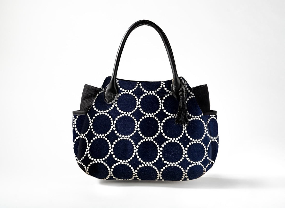 ぷっくりころんとしたシルエットと、ぽこぽこした刺繍が可愛いミナペルホネン生地&黒無地帆布の切り替えが特徴のテキスタイルデザインバッグです
