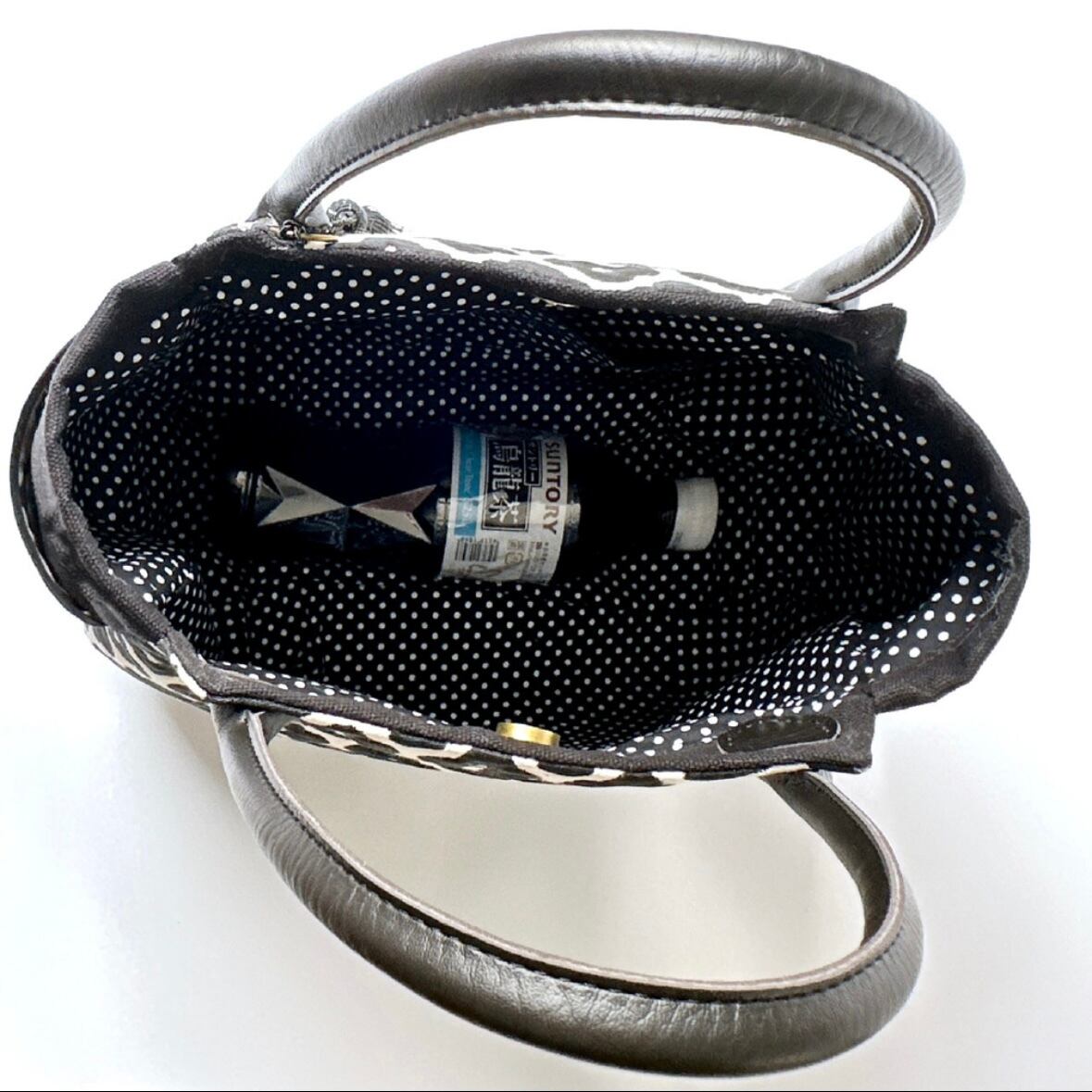 本体、サイドポケットはミナペルホネン生地、横マチと底は黒無地の切り替え仕立てとなっております
