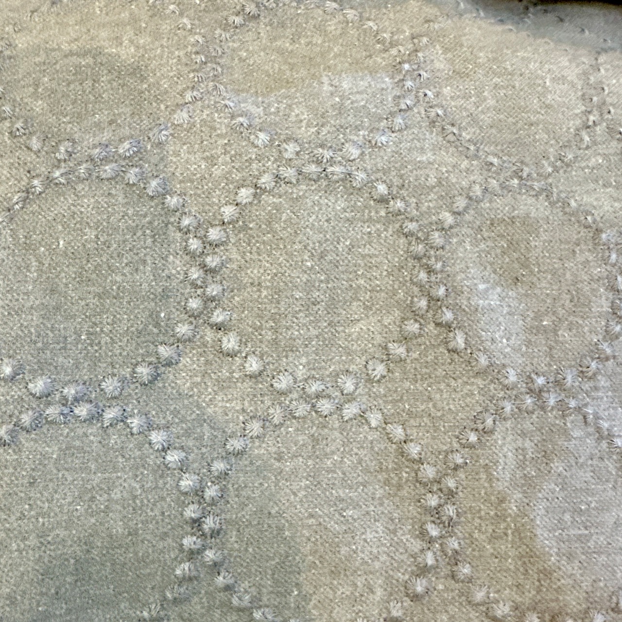 グレー地にグレーのサークル模様の刺繍が静かに映え、コーディネートに上品さと落ち着きのある雰囲気を添えてくれます。