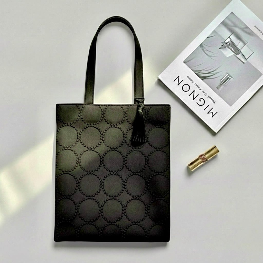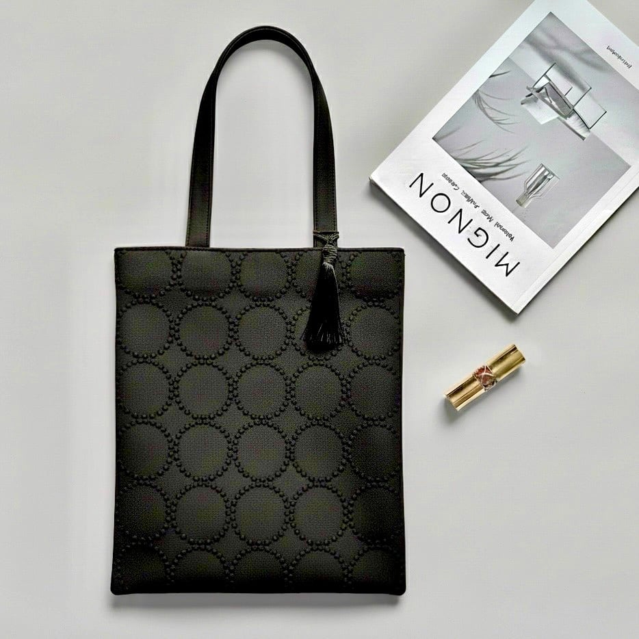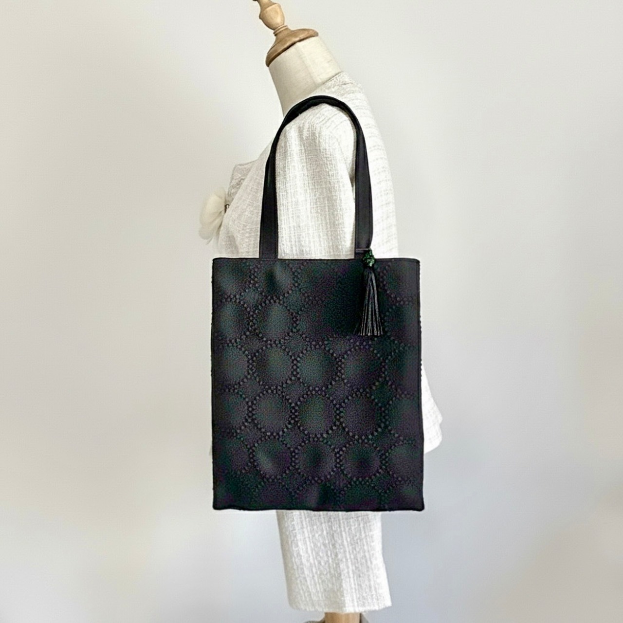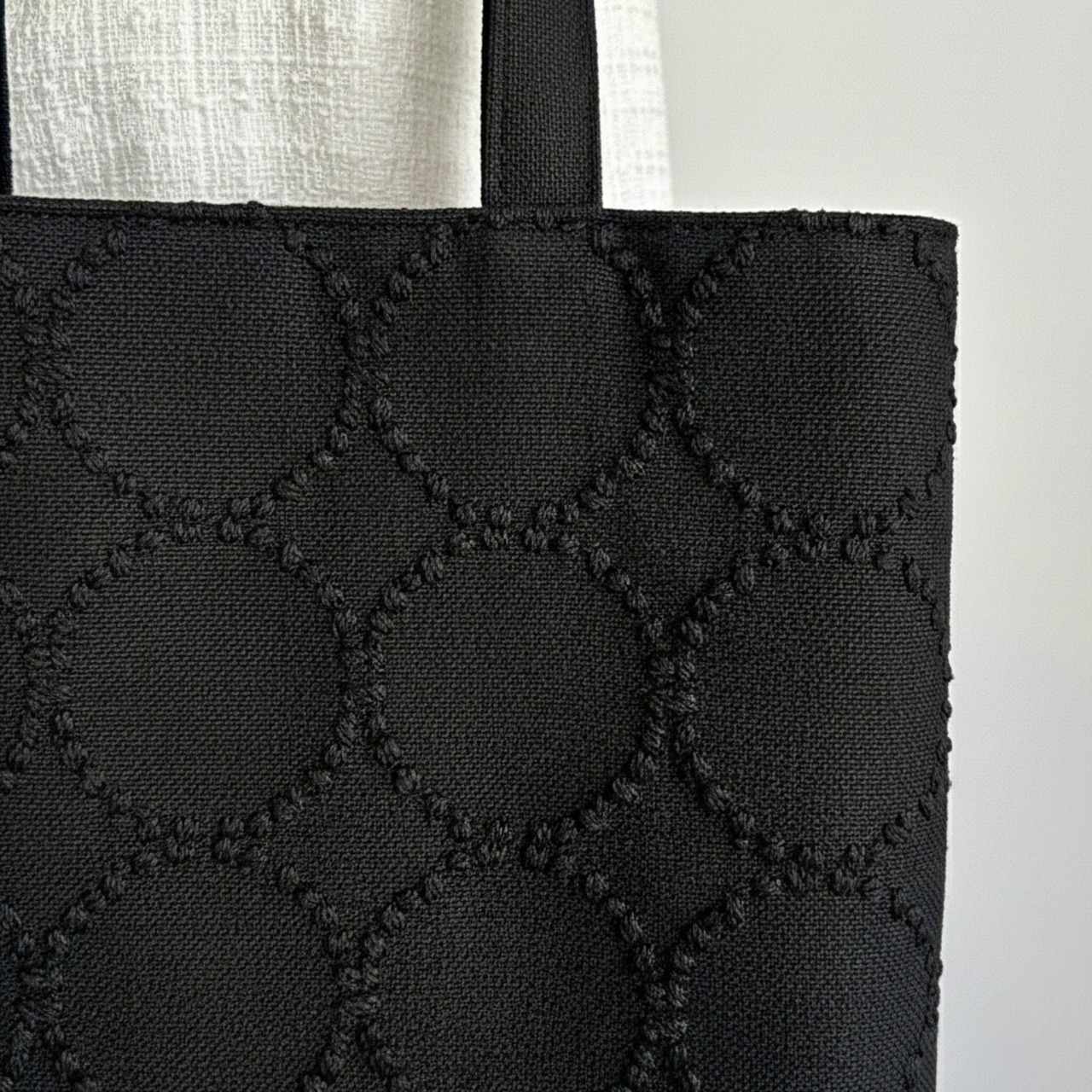 黒地に黒のサークル模様の刺繍が静かに映え、コーディネートに上品さと落ち着きのある雰囲気を添えてくれます。