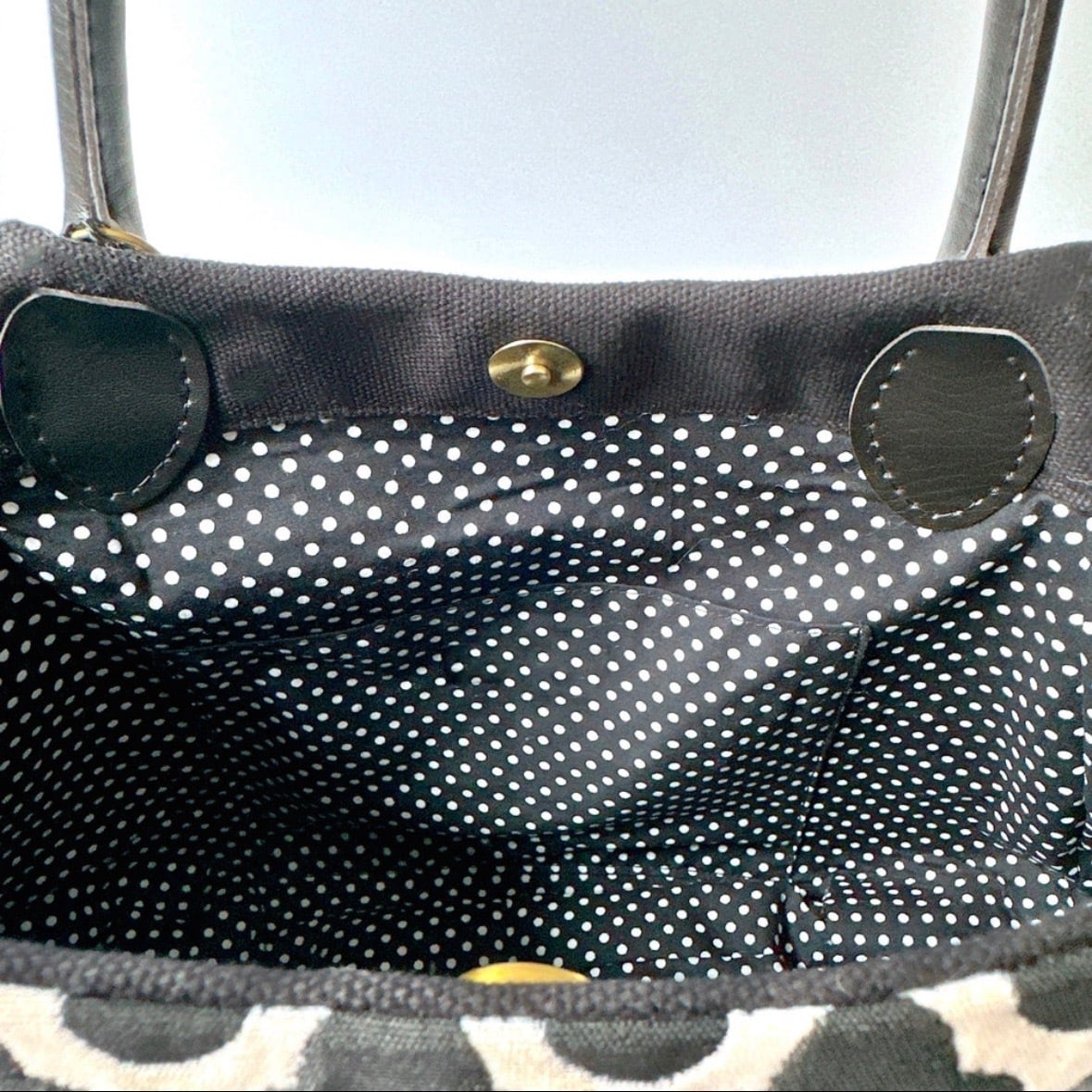ぷっくりころんと可愛いシルエットと、ふっくら織られたフランス生地&黒無地帆布の切り替えが特徴のバッグです