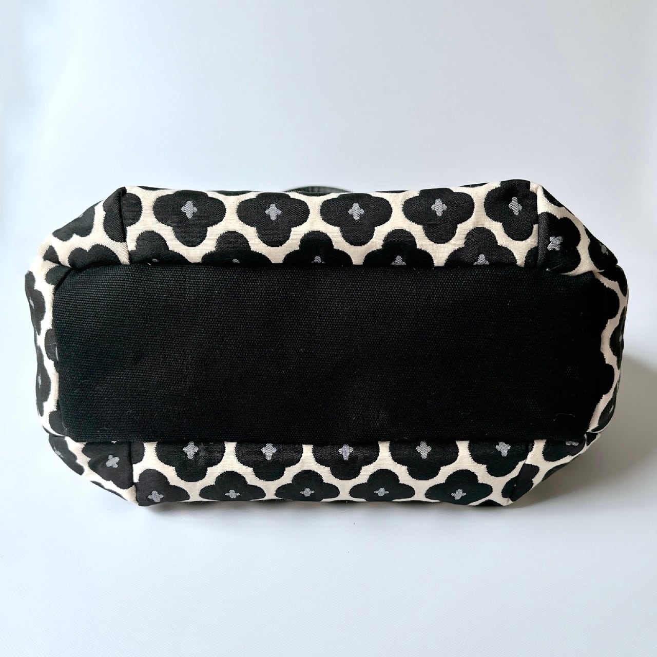 本体、サイドポケットは花柄、横マチと底は黒無地の切り替え仕立てとなっております