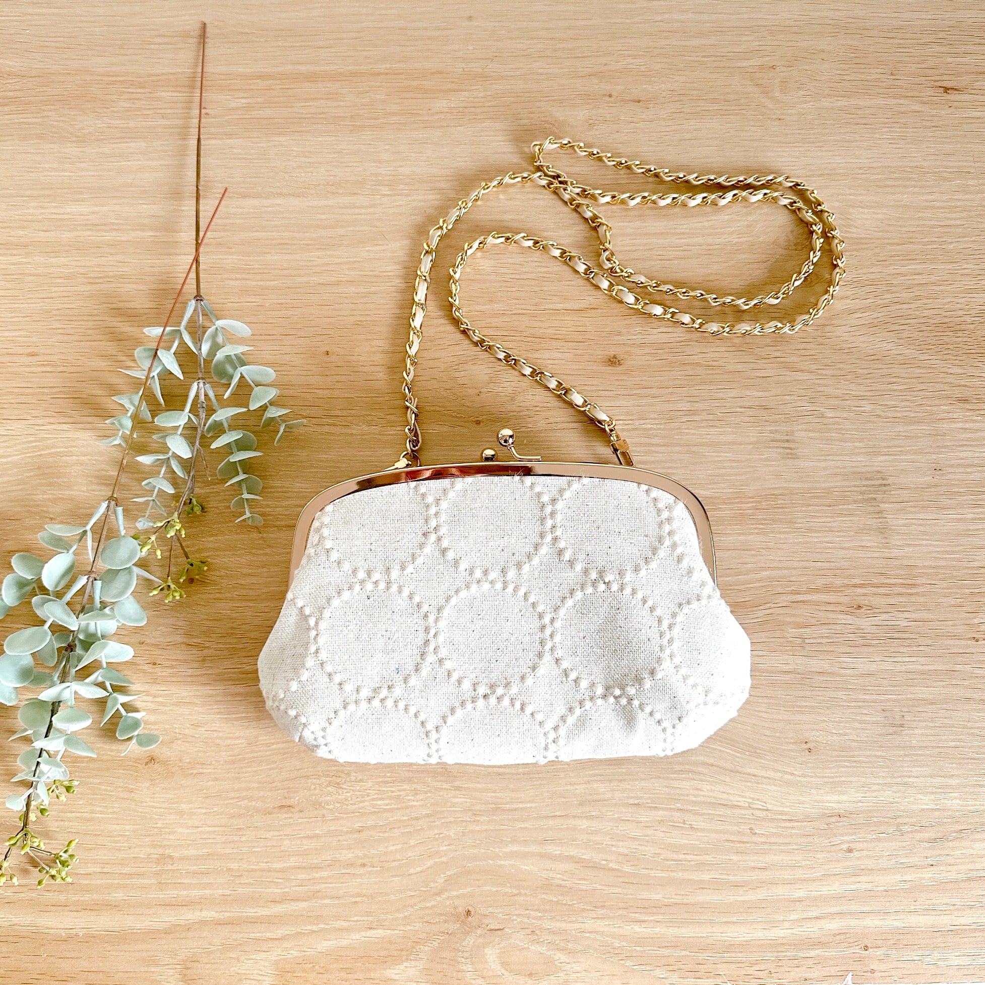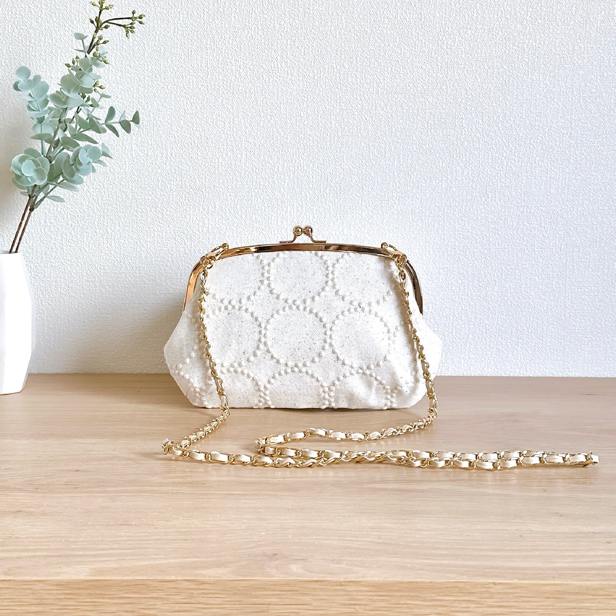 ミナペルホネン タンバリンホワイトのがま口ショルダーバッグ(レザーチェーンストラップ付き)