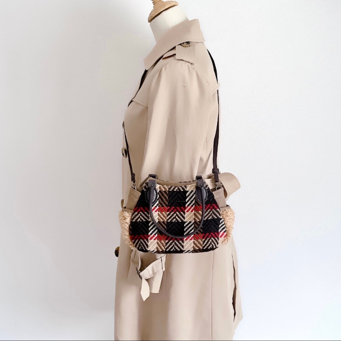 レトロ感が可愛いウールツイード生地とプードルボア、倉敷帆布の切り替え仕立てのサイドポケット付きのショルダーバッグです