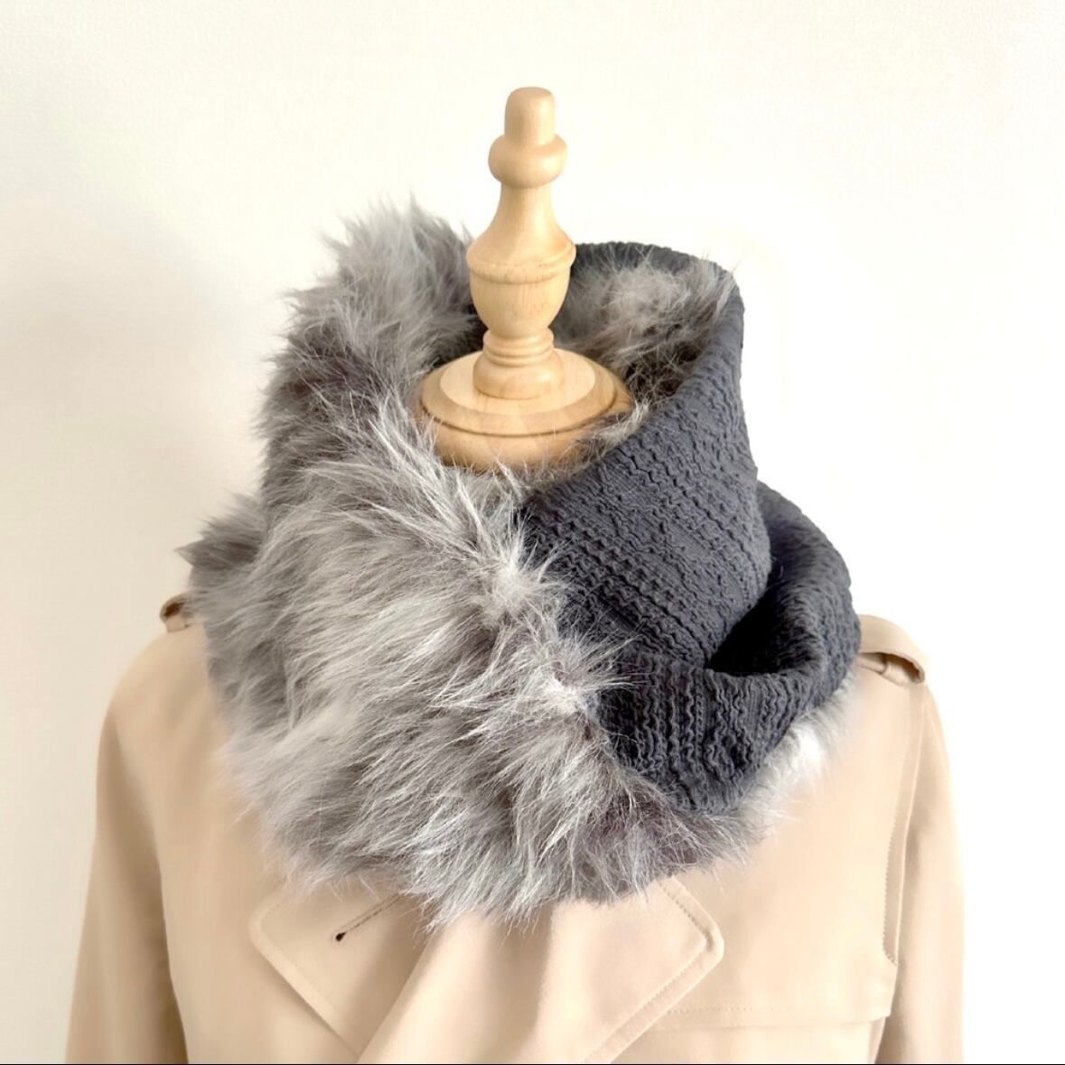 2種類の生地感の違いを出して楽しめるとともに、ひねり部分をずらすことでジャガードニットのみを表に、ロングファーだけを表にしたりと3通りの使い方が出来ます