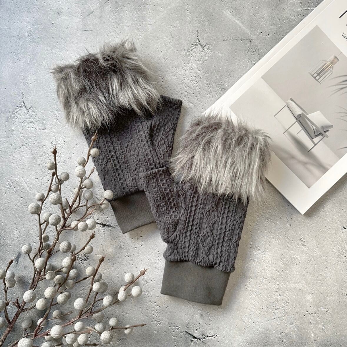 表地はアラン織りのジャガードニットを使用しており、縦のラインとふわふわのファーが指先を綺麗に見せてくれます
