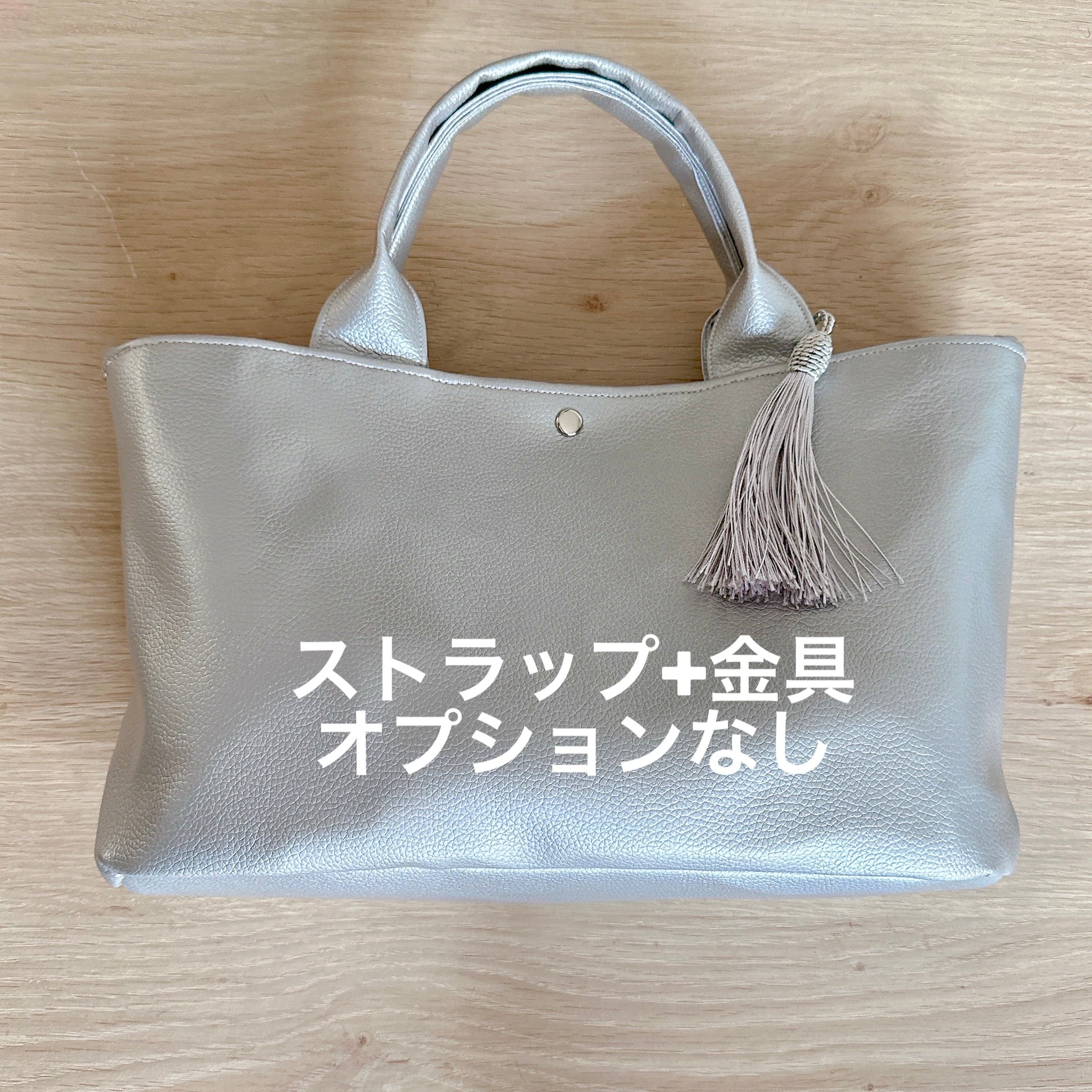 ※オプションにて同生地(シルバーPUレザー)のショルダーストラップ+ストラップ根元金具(バッグ本体上部にDカン)をお付けいたします